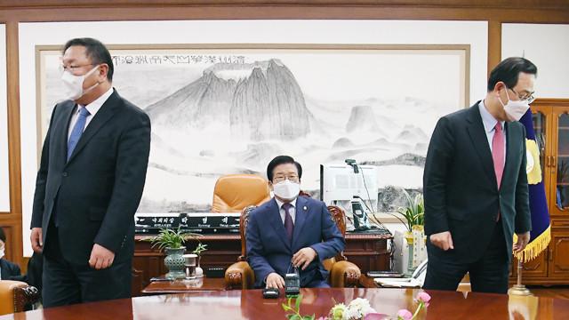 23일 오후 국회 의장실에서 더불어민주당 김태년 원내대표(왼쪽)와 국민의힘 주호영 원내대표(오른쪽)가 박병석 의장(가운데) 주재로 ‘공수처법 해법’을 논의하기 위해 회동하고 있다. /연합뉴스