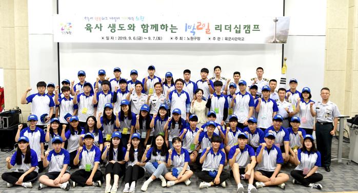 서울 노원구는 최근 육군사관학교에서 고등학생이 육군사관학교 생도와 멘토-멘티 활동을 하는 교육 프로그램인 ‘육사 생도와 함께하는 1박2일 리더십캠프’를 개최했다. 사진은 오승록 구청장과 학생들이 입소식에서 기념촬영을 하는 모습. (사진제공=노원구청)