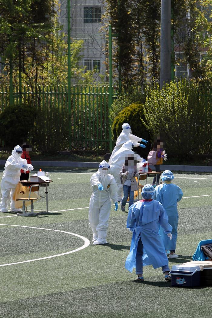 19일 오전 광주 광산구 한 초등학교 운동장에 코로나19 임시 선별진료소가 마련돼 재학생이 전수 검사에 참여하고 있다. 방역 당국은 국회의원 지역 사무소 관계자가 포함된 전남 담양 지인 모임 관련 확산세가 해당 초등학교에까지 미치자 재학생과 교직원을 대상으로 전수 검사에 나섰다.