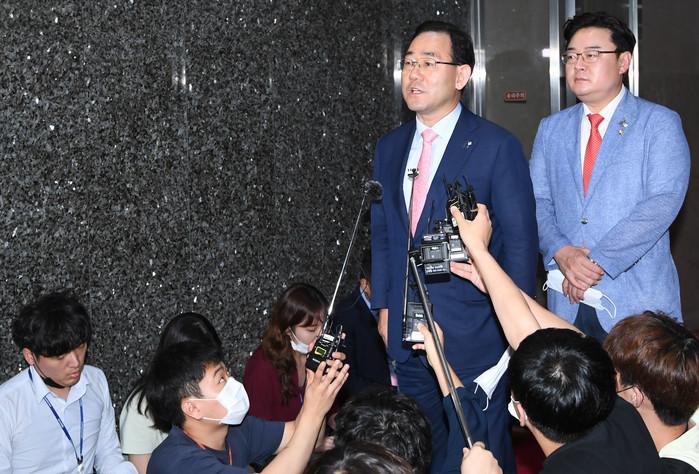 미래통합당 주호영 원내대표가 25일 오후 국회에서 박병석 국회의장과 상임위 원 구성 관련 면담을 마친뒤 취재진 질문에 답하고 있다.
