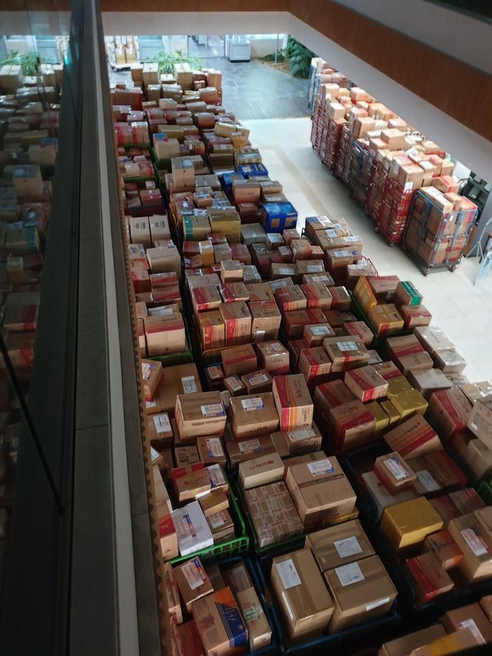 신종 코로나 바이러스가 퍼진 이후 중국의 가족·지인들에게 마스크를 보내는 사람들이 증가함에 따라, 중국으로 가는 택배가 일일 3000여건에서 하루 4만여건 이상으로 15배 증가했다. 사진은 인천공항 국제 우편센터로비에서 검수를 기다리고 있는 택배박스들의 모습. (사진제공=독자제보)