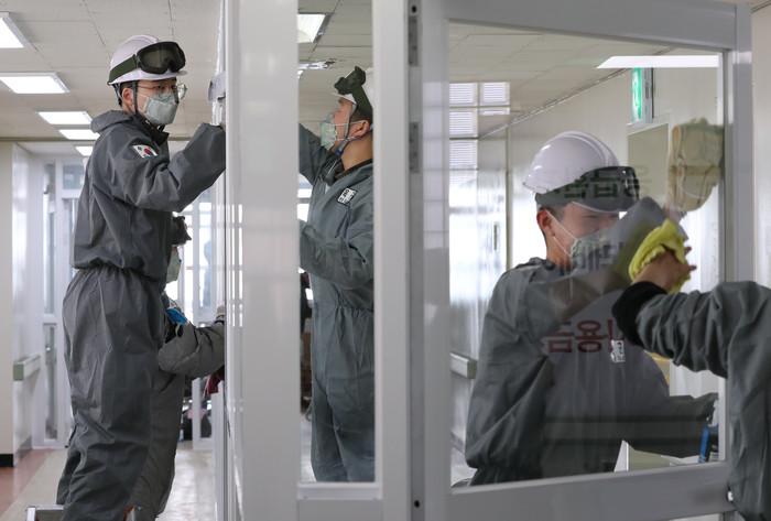 4일 경북 경산시 국군대구병원에서 육군 공병단 대원들이 코로나19 민간 확진자 수용을 앞두고 막바지 준비를 하고 있다. 국가감염병전담병원으로 지정된 국군대구병원은 필수 의료 인력 190여명을 확보해 5일부터 대구지역 민간 확진자를 진료한다.