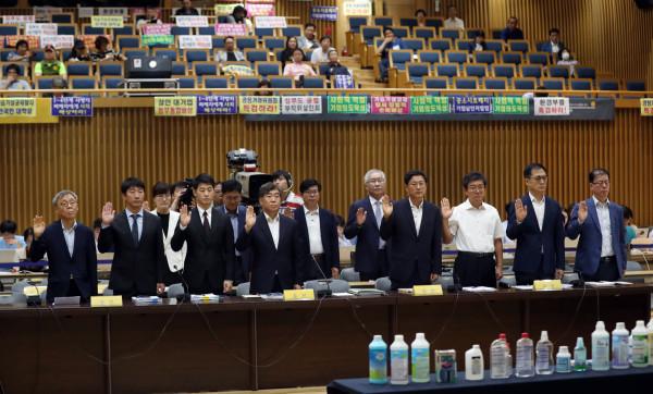 27일 서울시청 다목적홀에서 열린 2019 가습기살균제참사 진상규명 청문회 첫날 2세션에서 증인들이 선서하고 있다. 앞줄 왼쪽부터 이재구 전 공정위 비상임위원, 정현일 2017 공정위 가습기살균제 사건처리담당, 고영환 2016 공정위 가습기살균제사건처리 담당, 김성하 전 공정위 상임위원, 이정섭 전 환경부 차관, 박진원 전 국립환경과학원장, 장윤석 국립환경과학원장, 김필제 국립환경과학원장.