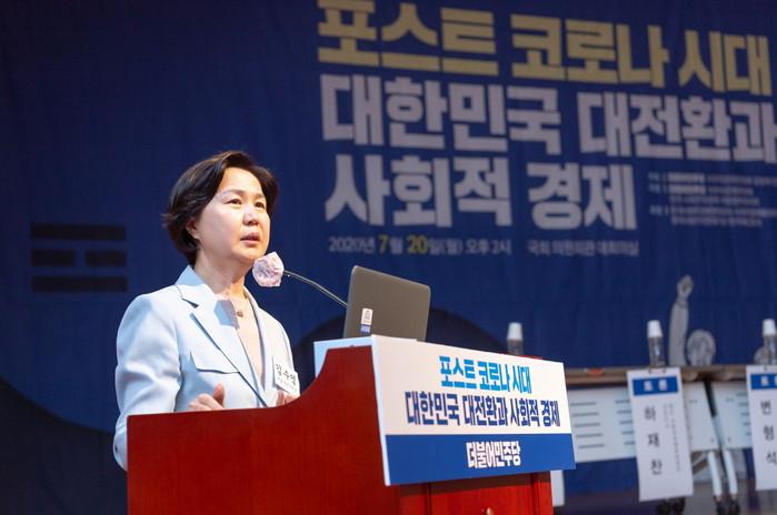 김수영 서울 양천구청장이 지난 20일 국회 의원회관 대회의실에서 ‘한국판 뉴딜의 지역화:전망과 과제’에 대해 주제발표를 하고 있다. 이 정책토론회는 지난 14일 정부가 발표한 '한국판 뉴딜'을 주제로 국회의원과 정부 관계자, 전문가 등이 이와 연계한 사회적 경제의 지역화 방안을 모색하고, 한국판 뉴딜을 성공시키기 위한 정책과 입법과제를 논의했다.