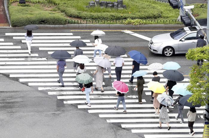 본격적인 장마가 시작된 5일 광주 북구청 교차로 교통섬에 지역 상권 활성화를 위해 밖으로 점심을 먹으러 나서는 북구청 직원들이 우산을 쓰고 횡단보도를 건너고 있다.