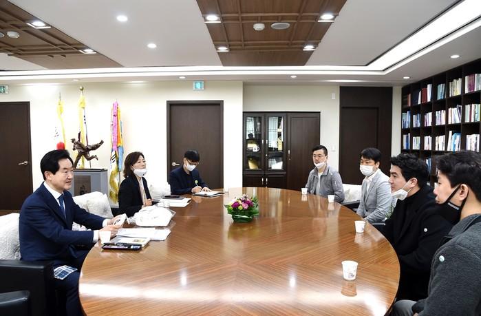 '의정부청목회'는 13일 코로나19 확산을 방지하고 지역사회에 도움이 되도록 경기 의정부시청을 방문해 면 마스크 2000장을 기부했다. 이날 전달된 면 마스크는 경기 사회복지공동모금회에 기탁돼 지역내 사회복지시설에 전달될 예정이다. 사진은 안병용 시장이 청목회 관계자들과 이야기를 나누는 모습.(사진제공=의정부시청)