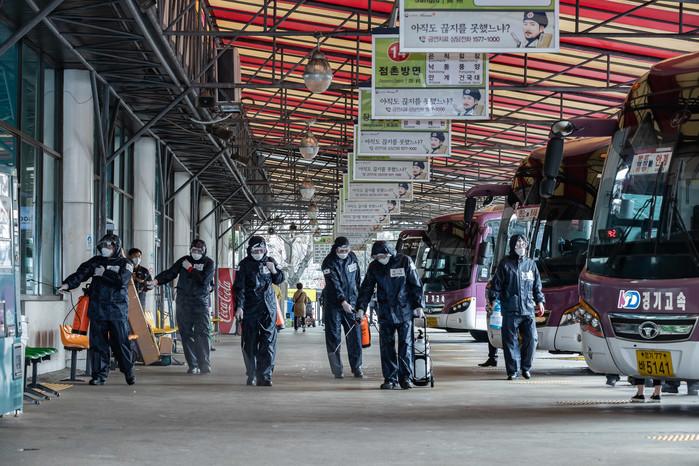 서울 광진구가 12일 동서울터미널 일대에서 육군 수도방위사령부 육군 지원팀과 함께 합동 방역을 실시했다. 이날에는 수방사 육군지원팀에서 14명이 지원을 나와 동서울터미널과 테크노마트, 강변역, 구의공원 주변 보도와 승강장, 내부 등을 집중 방역했다. 사진은 동서울터미널 하차장에서 구와 합동 방역을 실시하고 있는 수방사 육군지원팀의 모습.(사진제공=광진구청)