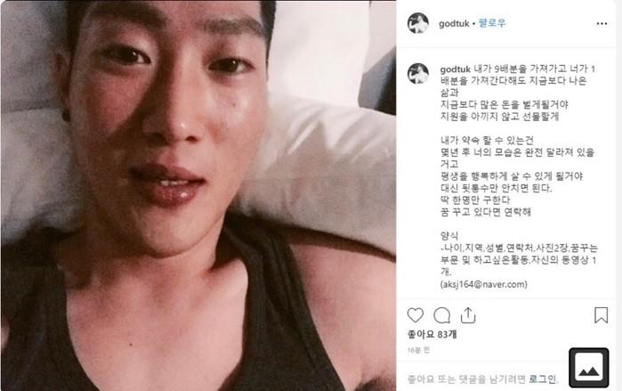 한편, 해당 방송 이후 턱형은 자신의 인스타그램계정에 “내가 9배분을 가져가고 네가 1배분을 가져가도 지금보다 나은 삶과 많은 돈을 벌 것. 뒤통수 치지마라. 한 명만 구한다. 꿈꾸고 있으면 연락하라”는 글을 게재했다.