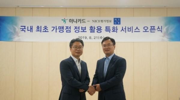 | ▲하나카드 정성민 디지털사업본부장(왼쪽), NICE평가정보 김종윤 CB사업2본부장이 기념촬영을 하고 있다.(사진제공=하나카드) |