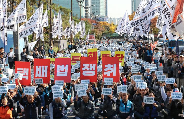 4일 오후 서울 여의도 국회 앞에서 열린 택배노동자 대회에서 참가자들이 생활물류서비스법 제정을 촉구하며 구호를 외치고 있다. 생활물류서비스법은 택배, 배송 대행 등 생활 물류 서비스를 정식 산업으로 규정하고 이를 육성·발전시키기 위한 법으로 택배 노동자 처우개선과 고용안정, 휴식 보장, 택배 노동자 보호 의무 강제 등 내용을 담고 있다.