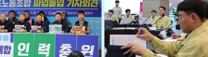 좌=전국철도노조와 철도하나로국민운동본부 조합원들이 18일 오후 서울 중구 민주노총에서 기자회견을 열고 철도 노동조합 20일 9시 총파업 돌입 계획을 밝히고 있다.