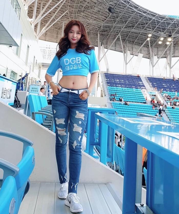 공개된 사진 속 이상미는 야구장에서 배꼽이 드러나는 하늘색 옷을 입고 카메라를 쳐다보고 있는 모습이 담겨 있다.