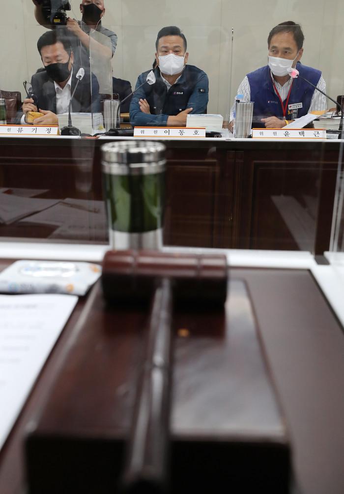 25일 오후 세종시 정부세종청사 고용노동부에서 열린 제2차 최저임금위원회 전원회의에 참석한 사용자 측 류기정 위원(왼쪽부터), 근로자측 이동호(한국노총 사무총장) 위원, 윤택근(민주노총 부위원장) 위원이 박준식 위원장의 발언을 경청하고 있다.