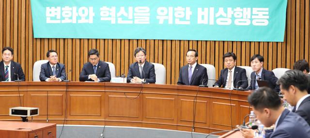 바른미래당 내 비당권파 모임 ‘변화와 혁신을 위한 행동’(변혁) 대표인 유승민 의원(왼쪽 네번째)이 29일 오전 국회에서 열린 국회의원-지역위원장(원외) 연석회의에서 발언하고 있다. /연합뉴스