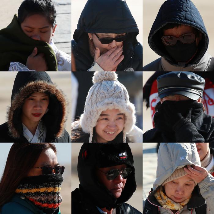 체감 온도가 영하 2.2도까지 떨어진 14일 오후 서울 경복궁에서 추위를 피하기 위해 두터운 옷과 모자,목도리로 무장한 외국인 관광객들의 모습.