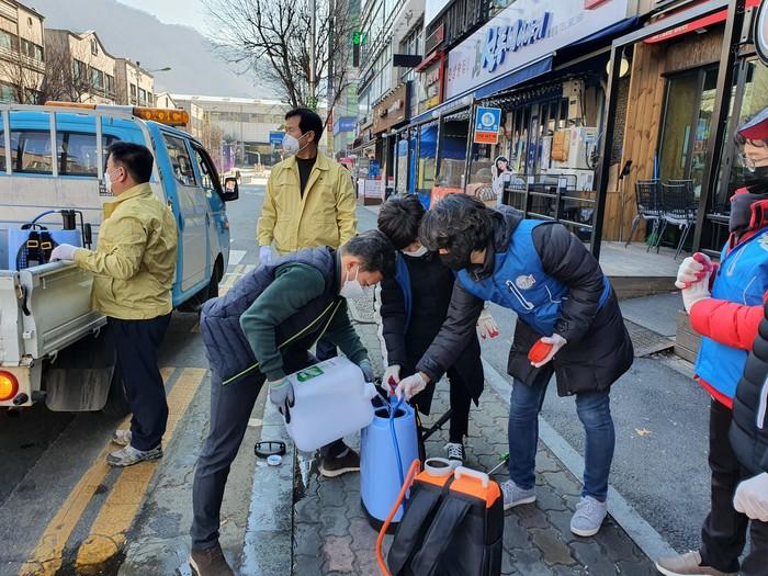 경기 남양주시 호평내내행정복지센터는 5일 코로나19 확산에 따라 시의원 및 사회단체회원 등 50여명과 함께 지역내 음식점과 상점이 밀집돼 있는 사가연 문화거리 등을 중심으로 일제 방역을 했다. 사진은 소독제를 채우고 있는 모습.(사진제공=남양주시청)