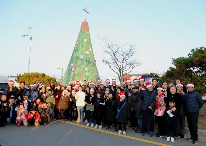 전남 영암군은 최근 영암읍 공설운동장 입구와 삼호읍 영산호 입구에 군민의 마음에 따뜻한 온기를 전해줄 성탄트리를 설치하고 점등식을 개최했다. 사진은 점등식에 참석한 주민들이 성탄트리 앞에서 산타 모자를 쓰고 기념촬영을 하는 모습.(사진제공=영암군청)