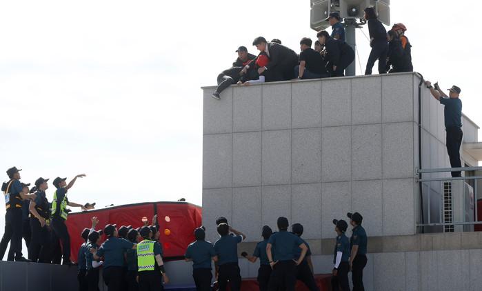 18일 오전 울산시의회 옥상에서 고공 농성을 하던 경동도시가스 안전점검원(주황색 모자)들이 경찰 관계자들에게 연행되고 있다. 이들은 도시가스 방문 점검 시 성폭력을 방지할 대책이 필요하다며 올해 5월 20일부터 울산시청 본관 앞에서 농성했지만, 협의가 이뤄지지 않자 17일 오후 고공 농성에 돌입했다.