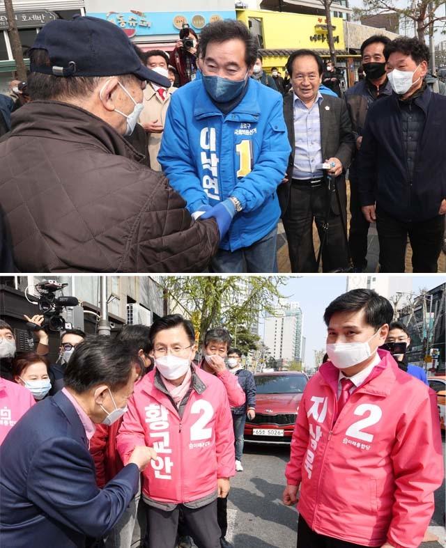 4.15 총선 서울 종로에 출마한 더불어민주당 이낙연 후보가 7일 오전 종로구 재동초등학교 앞 교차로에서 시민들과 인사하고 있다(위). 미래통합당 서울 종로 황교안 후보와 중구 성동을 지상욱 후보가 7일 서울 중구 중앙시장에서 시민들을 직접 만나며 유세하고 있다. /연합뉴스