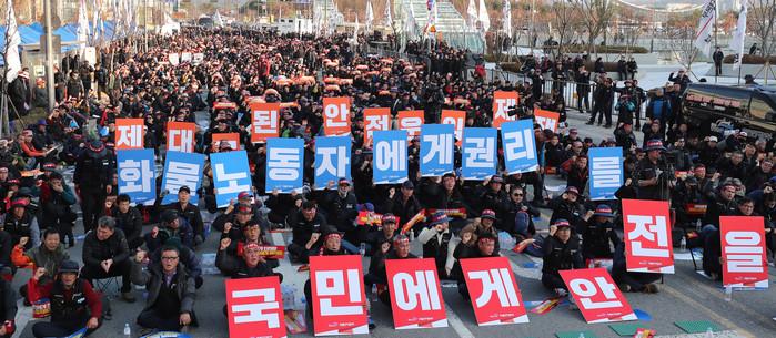 민주노총 공공운수노조 화물연대본부 관계자들이 26일 오후 세종시 정부세종청사 국토교통부 앞에서 화물연대 총파업 선포 결의대회를 하고 있다.