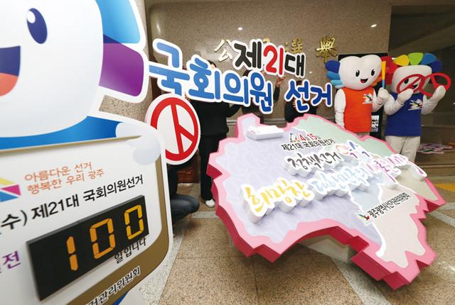 6일 오후 광주 서구 치평동 광주광역시선거관리위원회에서 선관위 직원들이 100일 앞으로 다가온 제21대 국회의원선거를 홍보하는 퍼포먼스를 하고 있다. /연합뉴스