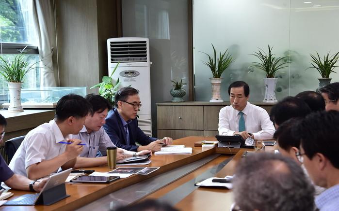 ▲ 문석진 구청장이 지난 5일 구청 회의실에서 태풍 피해 대비를 위한 긴급 간부회의를 주재하고 있다. (사진제공=서대문구청) |