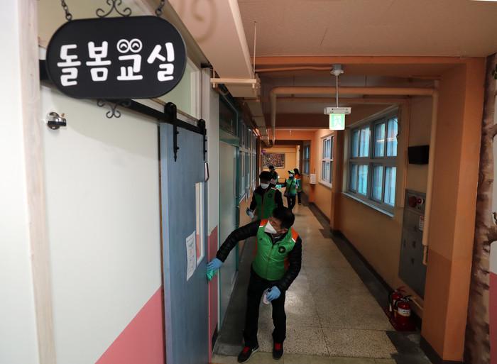 서울 강남구가 지난 20일 직원 6명 및 자율방재단원 14명과 함께 개포2동에 있는 다중이용시설과 위생 취약지역에 코로나 확산 예방을 위한 합동 방역을 실시했다. 사진은 개포2동 주민센터 직원 및 자율방재단원들이 코로나 예방 차원으로 학교 내부시설을 닦고 있는 모습.(사진제공=강남구청)