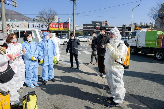 전남 순천시가 5일 코로나19 확산 예방을 위해 '전 시민 일제 방역의 날'을 개최했다. 이날 허석 시장을 비롯해 읍·면·동 자율방역단 등 1700여명은 시 다중이용시설 등 1600곳을 방역했다. 사진은 허 시장이 방역에 앞서 참여자들에게 안전을 당부하는 모습. (사진제공=순천시청)