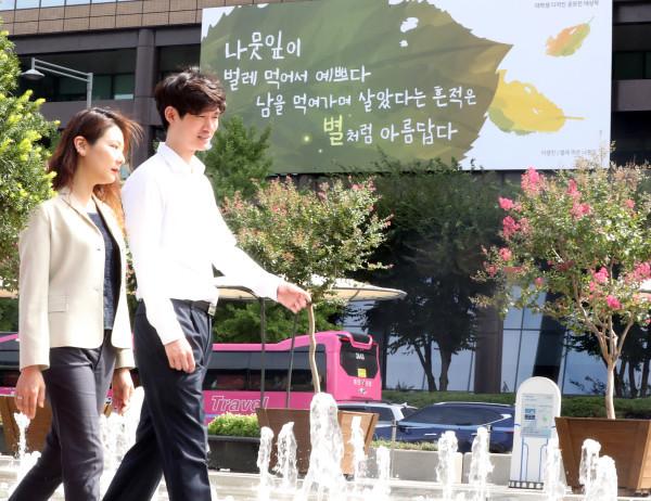서울 교보생명 광화문 글판 '가을편'에 이생진 시인의 시 '벌레 먹은 나뭇잎'의 글귀가 2일 실렸다. 이생진 시인은 섬과 바다의 아름다움을 노래한 대표적 원로 시인으로 그의 대표작 '먼 섬에 가고 싶다'는 윤동주 문학상, '혼자 사는 어머니'는 상화시인상을 수상했다.