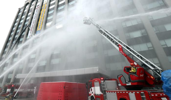 28일 서울 중구 계동 현대사옥에서 테러로 인한 화재 상황을 가정해 열린 재난대응안전한국훈련에서 고가 사다리차를 비롯한 소방장비가 화재진압을 위해 물을 뿌리고 있다.