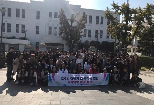 | 해남교육지원청(교육장 장성모) 학교지원센터, 지난 18일부터 19일까지 1박 2일 동안 광주에서 관내 초·중학교 학생회 임원 70명을 대상으로 역사 및 문화 체험과 자치서클 진행 등의 프로그램으로 자치역량 함양 캠프를 실시했다. =사진, 국립아시아문화의 전당(구 전남도청)앞 기념사진 촬영 / 해남교육지원청 제공 |