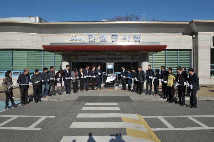 경기 동두천시가 행정안전부 주관 국민행복민원실로 선정돼 12일 민원실 현관 앞에서 최용덕 시장, 이성수 의장, 도의원, 시의원 및 간부공무원 등 40여명이 참석한 가운데 '국민행복민원실 현판 제막식'을 개최했다. 사진은 현판 제막 모습. (사진제공=동두천시청)