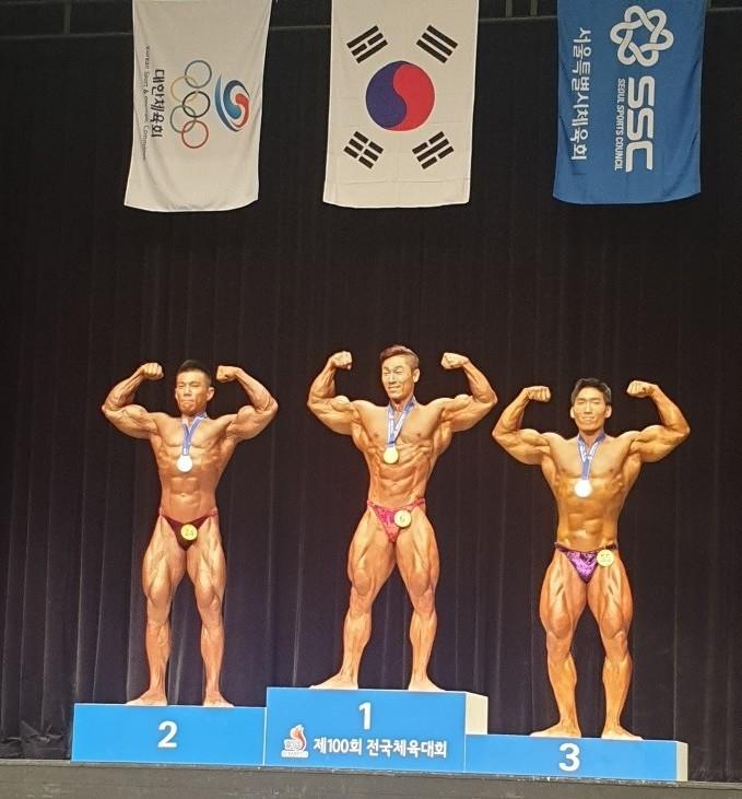 서울 광진구 소속 보디빌딩 선수단이 지난 5·6일 서울 올림픽공원 올림픽홀에서 열린 '제100회 전국체육대회 보디빌딩대회'에서 금메달 1개와 은메달 3개를 획득했다. 사진은 보디빌딩대회에 출전해 금메달을 획득한 광진구 소속 유인성 선수(가운데)의 모습.(사진제공=광진구청)