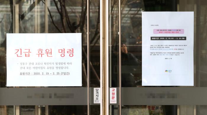 코로나19 32번째 확진자가 발생한 19일 오전 서울 성동구의 한 어린이집 입구에 긴급 휴업 안내문이 붙어 있다.