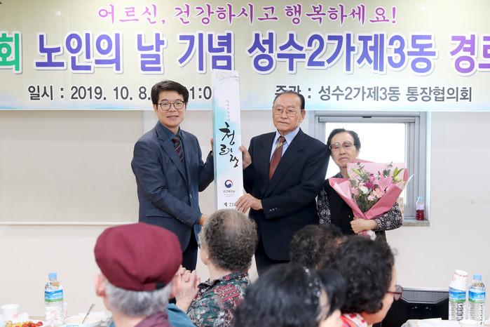 서울 성동구는 최근 '경로의 달 및 제23회 노인의 날'을 맞이해 지역내 17개동 곳곳에서 저소득 노인 200~300명이 참석한 가운데 경로행사를 개최했다. 사진은 정원오 구청장(오른쪽)이 '청려장 지팡이'를 노인에게 전달한 모습.(사진제공=성동구청)