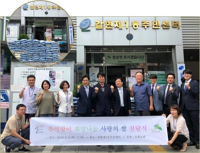 서울 은평구 갈현1동 주민센터가 최근 갈현1동 은현교회로부터 ‘사랑의 쌀’ 1000kg(10kg·100포)을 전달받았다. 이번에 전달받은 쌀은 갈현1동 지역내 저소득 100가구에 지원될 예정이다. 사진은 사랑의 쌀 전달 후 기념촬영을 하고 있는 관계자들의 모습.(사진제공=은평구청)