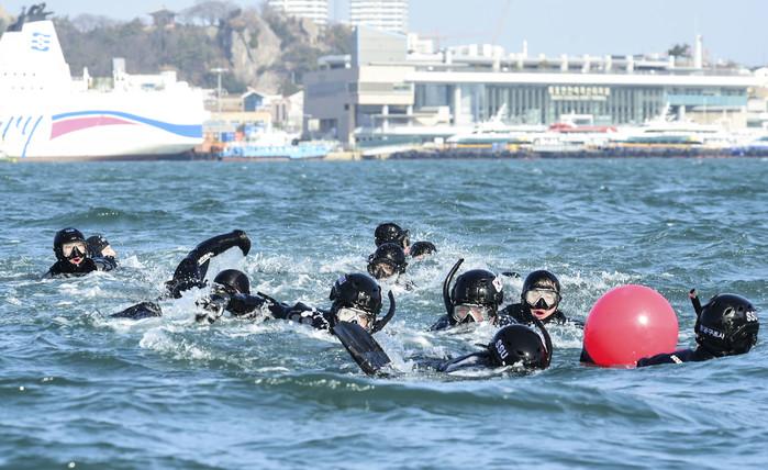 대한(大寒)인 20일 오전 해군 제3함대사령부 8구조작전중대 해난구조대원(SSU)들이 목포 군항 부두 앞바다에서 혹한기 훈련의 하나인 핀 마스크 수영을 하고 있다.