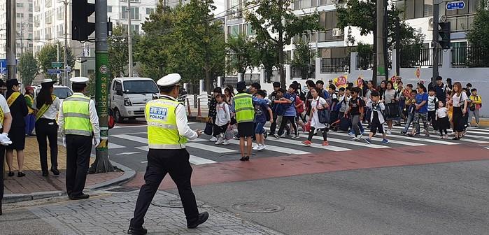 인천 서구는 어린이 교통사고 예방 및 안전한 통학로 확보를 위한 ‘어린이보호구역내 교통사고 제로화를 위한 교통안전캠페인’을 실시하고 있다. 사진은 최근 석남초등학교 통학로에서 경찰관들이 학생을 대상으로 교통 안전지도를 하고 있는 모습.(사진제공=서구청)
