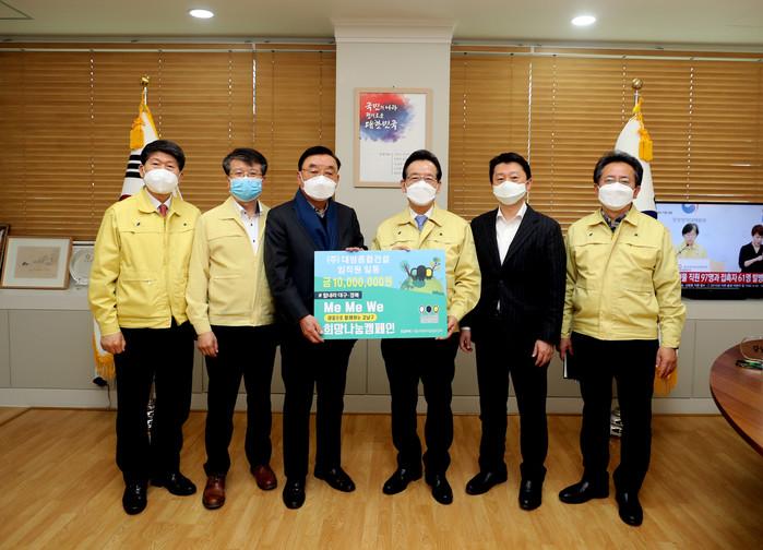 정순균 서울 강남구청장(왼쪽에서 세 번째)이 최근 구청장실에서 (주)대명종합건설로부터 대구·경북지역 주민을 돕기 위한 '희망나눔캠페인' 기부금 1000만원을 전달받았다. 이 기부금은 코로나19로 어려움을 격고 있는 대구·경북지역 주민들에게 전달될 예정이다. 사진은 기부금을 받고 기념촬영을 하고 있는 정 구청장의 모습.(사진제공=강남구청)