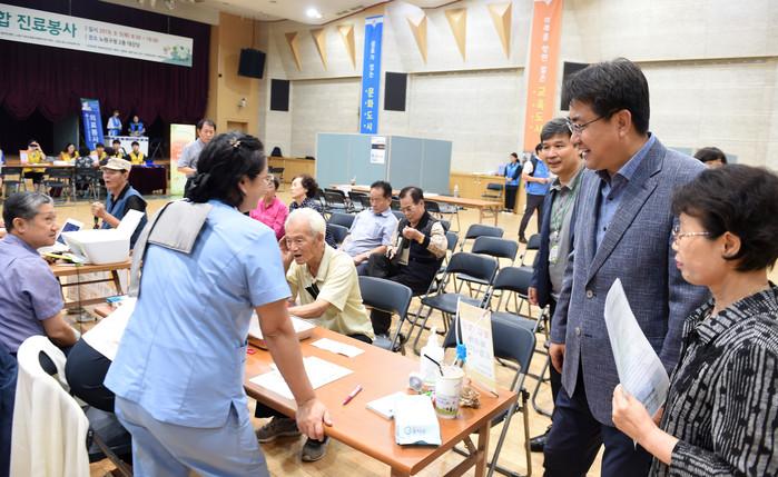 서울 노원구는 최근 구청 대강당에서 ‘2019년 노원구 병원연합 진료 봉사’를 개최했다. 이날 의료진들은 노인을 대상으로 초음파, 골밀도 검사 등의 진료봉사를 했다. 사진은 오승록 구청장이 노인들의 진료 상황을 살피고 있는 모습. (사진제공=노원구청)