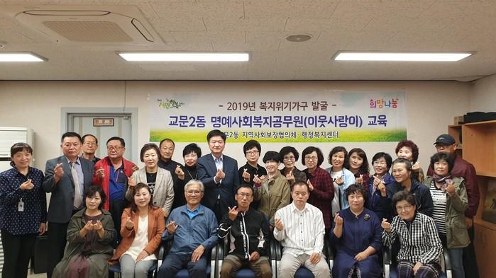 경기 구리시 교문2동은 최근 주민, 복지 통장, 지역사회보장협의체 위원 등 28명이 참석한 가운데 '복지사각지대 발굴 활성화를 위한 명예사회복지공무원 역량 강화 교육 및 특화사업 추진 설명회'를 개최했다. 사진은 기념촬영을 하는 모습.(사진제공=구리시청)