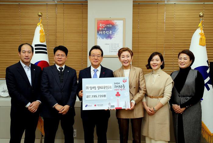 정순균 서울 강남구청장(왼쪽에서 세 번째)이 3일 오전 11시 구청장실에서 열린 ‘2020 희망온돌 따뜻한 겨울나기 후원금 전달식’에서 임서영 영재교육연구소로부터 후원금을 전달받았다. 전달받은 후원금은 저소득층의 겨울살이에 보탬이 될 예정이다. 사진은 기념촬영 모습.(사진제공=강남구청)