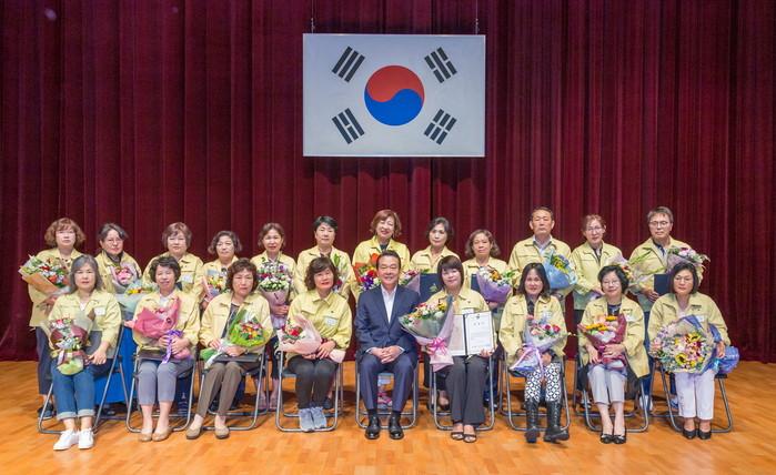 노현송 서울 강서구청장은 최근 강서구민회관에서 열린 ‘민방위통대장 역량 강화 교육’에 참석해 민방위 업무추진에 기여한 통대장 20명에게 표창장을 수여하고 격려했다. 사진은 노 구청장(앞줄 가운데)과 모범 통대장들이 기념촬영을 하는 모습. (사진제공=강서구청)