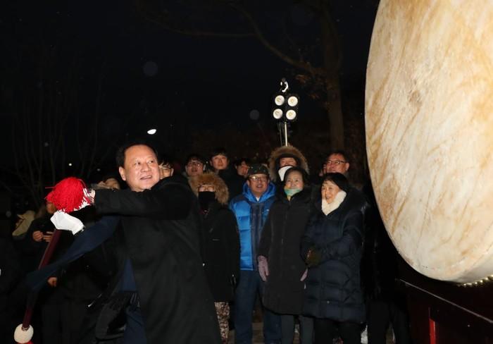 서울 마포구가 2020년 경자년 쥐띠해를 맞이해 최근 월드컵공원내 하늘공원에서 유동균 구청장을 비롯해 2만여명의 주민과 함께 '2020 하늘공원 해맞이 행사'를 개최했다. 사진은 유 구청장이 대북 타고 행사에 참여하는 모습. (사진제공=마포구청)