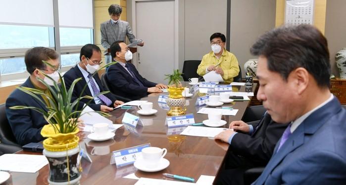 경기 광주시가 '사회적 거리두기' 집중 캠페인 전개를 위해 26일 시청 접견실에서 기독교연합회와 간담회를 개최했다. 간담회에는 신동헌 시장, 연합회 임원과 주요 교회 관계자 10명이 참석했다. 사진은 신 시장이 관계자들에게 적극적인 참여를 당부하는 모습. (사진제공=광주시청)