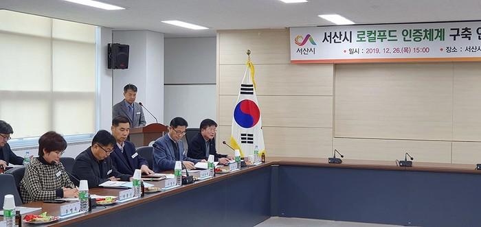 충남 서산시는 지역 먹거리의 안전성 확보를 위해 로컬푸드 자체 인증체계 구축 연구 용역을 완료하고 최근 완료보고회를 개최, 로컬푸드 생산현황 및 인증절차, 자체 인증대상 품목군별 안전성 기준 등에 대해 논의했다. 사진은 보고회 진행 모습.(사진제공=서산시청)