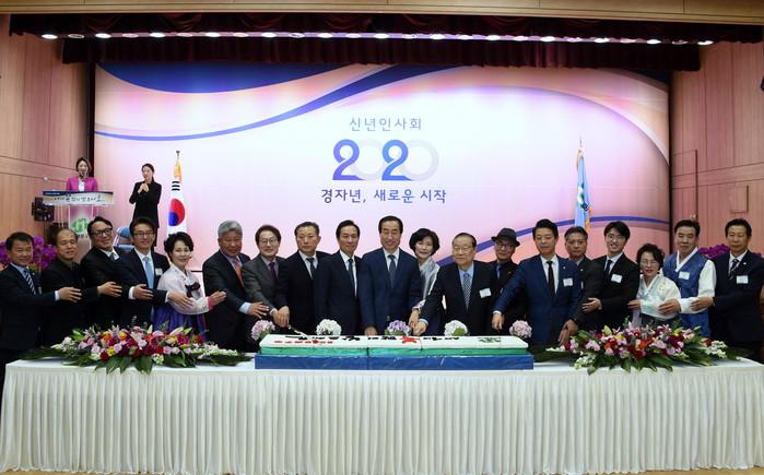 서울 서대문구가 16일 구청 대강당에서 주민과 직능단체 대표, 각계 인사 등 2000여명이 참석한 가운데 '신년인사회'를 열고 '지속가능한 미래지향도시' 구현을 위한 의지를 다졌다. 사진은 문석진 구청장(가운데)과 참석자들이 축하 시루떡을 자르는 모습. (사진제공=서대문구청)