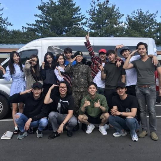 공개된 사진에는 MBC ‘왕은 사랑한다’ 팀이 임시완 면회를 간 모습이 담겨 있다. 군복을 입고 경례 포즈를 취하고 있는 임시완을 비롯해 윤아, 홍종현, 오민석, 박환희, 김정욱 등이 참석해 훈훈함을 과시했다.