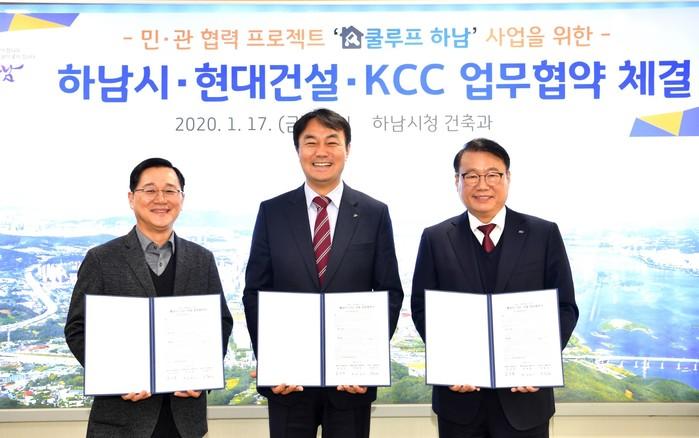 경기 하남시는 17일 시장실에서 ‘쿨루프 하남’ 사업 추진을 위해 현대건설(주), (주)KCC와 업무협약을 체결했다. 이 사업은 노후건축물 지붕에 차열페인트를 도색해주는 것이다. 사진은 김상호 시장(가운데)과 관계자들이 기념촬영을 하는 모습.(사진제공=하남시청)