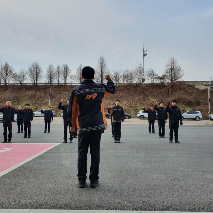 전남 영광소방서는 ‘소방정신 119소방강령’을 통해 조직의 소속감과 소방에 대한 자긍심 고취 및 결속력을 다지고자 매일 교대점검 시간에 119소방강령 결의대회를 열고 있다. 사진은 최근 열린 결의대회에서 소방 공무원들이 결의를 다지는 모습.(사진제공=영광소방서)